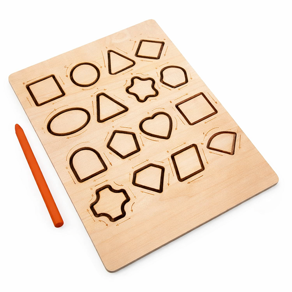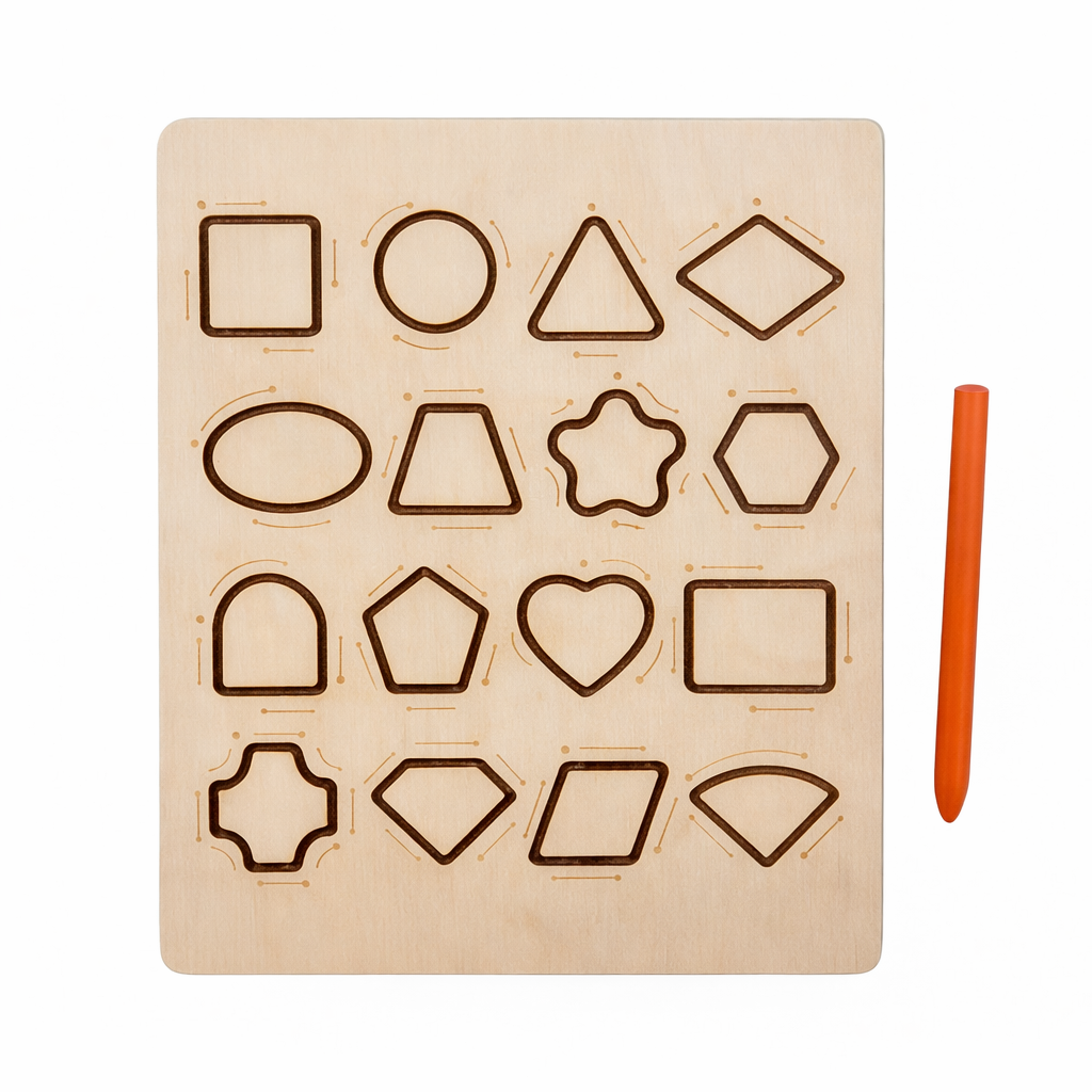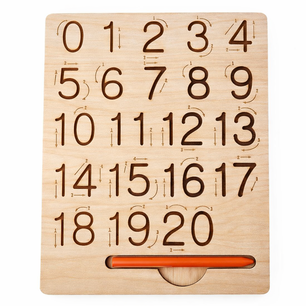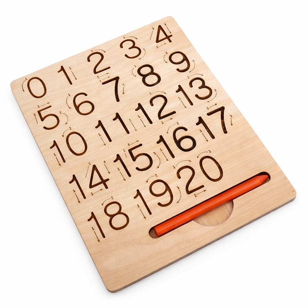 This wooden tracing board helps toddlers master numbers 0–20, geometric shapes, patterns, and early handwriting skills. The engraved grooves guide each stroke, making letter formation, counting, sequencing, and muscle memory development simple and enjoyable.