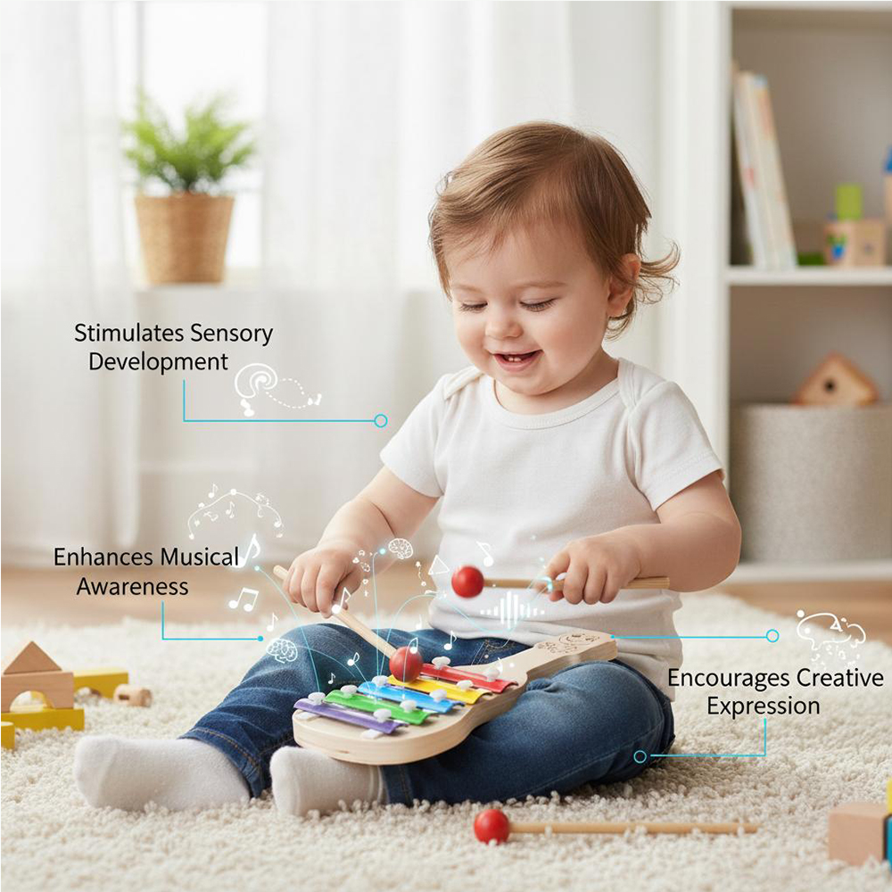 The ergonomic mallets, gentle tones, and polished wooden frame ensure babies can play freely and safely—day after day.